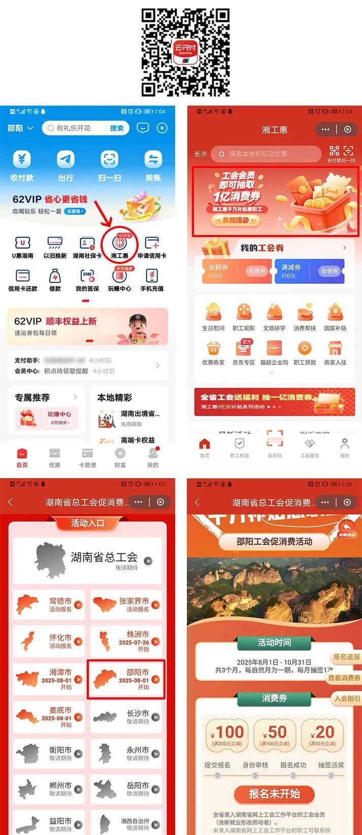 参与会员需下载“云闪付”APP,完成实名注册和银行卡绑定,进入“湘工惠”活动页面报名。