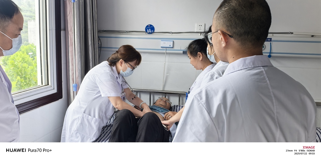 门诊间隙,黄爱群深入病房,带领山江镇卫生院医生检查在架病历。她认真询问每位患者的病情,细致查体,手把手指导诊疗规范。楼下门诊一有患者等候,她便即刻折返,不愿让乡亲多等。汗水浸湿白大褂,她却说:“来基层,就要做实事,每一分钟用在乡亲身上才值得。”这份执着,深深感染着在场医护人员。