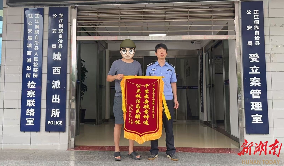 湖南法治报·新湖南客户端讯(通讯员 杨翠 徐英鹏)7月21日下午,受害人刘先生满怀感激地将一面印有“千里出击破案神速、公正执法为民解忧”的锦旗送到怀化芷江公安局城西派出所民警手中,并握着民警的手连声致谢。