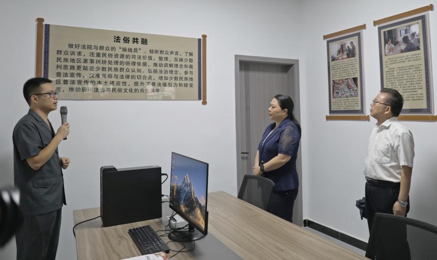 随后,调研组实地参观吉信法庭的党员活动室、学习室和展览室,并观看纪实片《苗岭追“枫”者》,透过镜头感受法官背着国徽跋涉苗岭开展巡回审判、人大代表参与纠纷调解的生动场景。