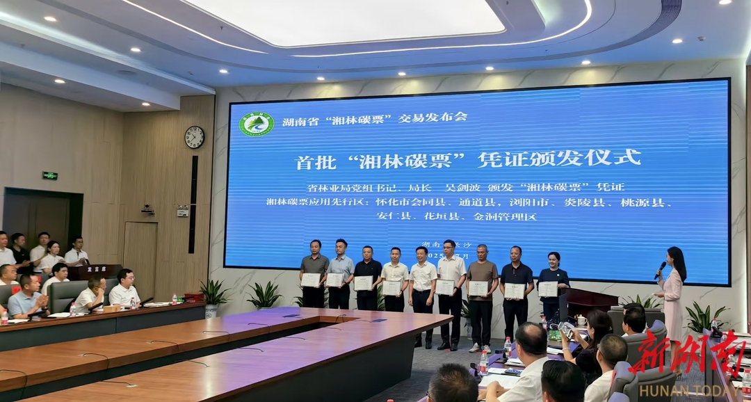 “湘林碳票”是指湖南省内权属清晰的林地、林木所产生的碳汇量,依据相应方法学,经计量、监测、审核、登记、签发等程序而制发的温室气体自愿减排量凭证,其兼具碳减排量证明、资产权属确认和金融赋能三重属性,是推动生态资源资产化的核心载体。2024年7月,湖南省林业局综合考虑前期林业碳汇试点开展情况、外资项目经验积累、社会影响力、地区鲜明特色、生态产品价值实现等因素,确定了怀化市、永州市金洞管理区等7个市、县(区)为2024年度“湘林碳票”应用先行区,并向全社会公布。2025年4月,省林业局签发全省首批8张湘林碳票凭证。
