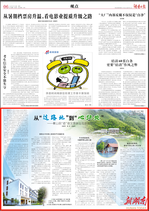 “拉长旅游产业链条,深挖本地生态、文化资源,大力发展民宿产业,以自身优势资源互补南岳,主动融入环南岳衡山旅游经济圈,让更多游客从‘路过’变为‘停留’,将衡山县从‘过路地’升级为‘心归处’。”衡阳市政协副主席、衡山县委书记戴新贤说。