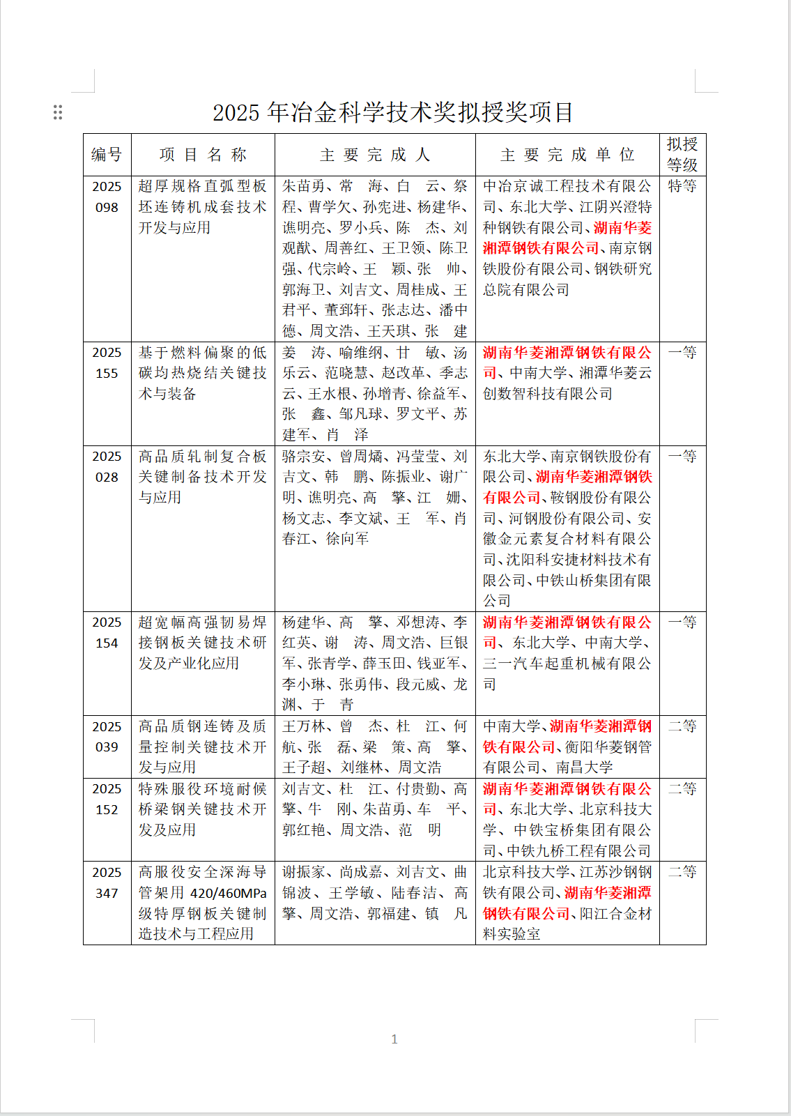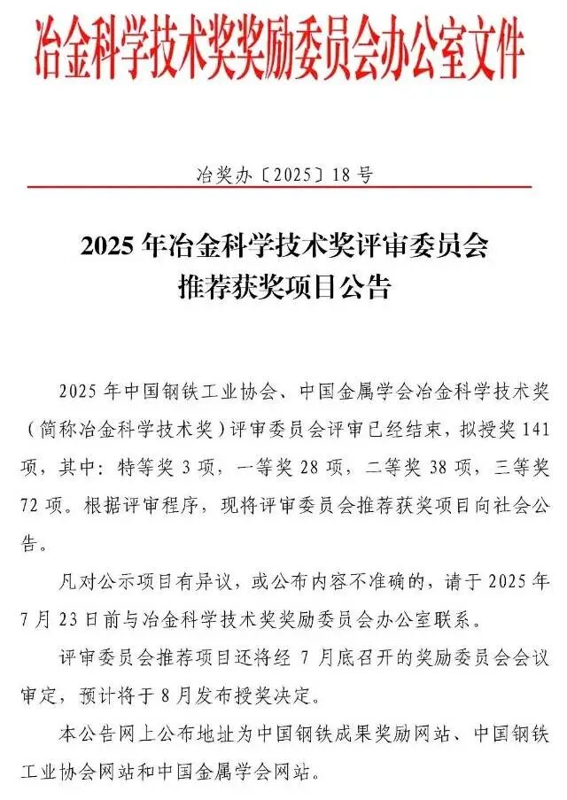 近日,中国钢铁工业协会、中国金属学会发布2025年冶金科学技术奖推荐获奖项目公告,湘钢7项科技成果榜上有名,其中特等奖1项、一等奖3项,二等奖3项。