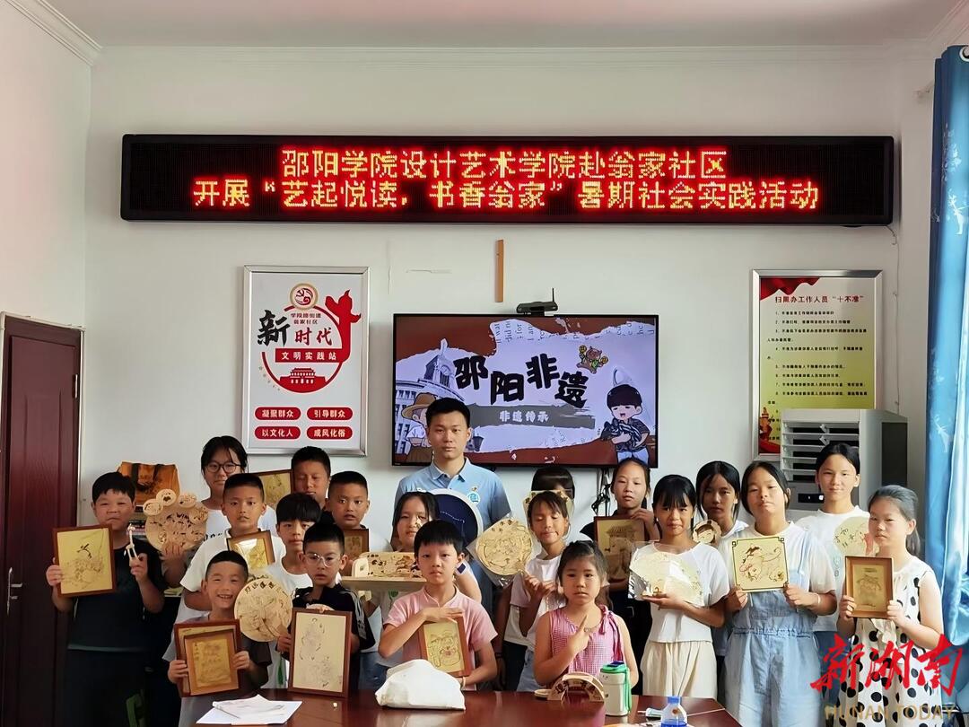 为了让孩子们感受传统文化的魅力,实践队特意准备了国家级非物质文化遗产“蓝印花布”和“宝庆烙画”的体验活动。队员们带来蓝印花布的样品,展示其蓝白相间的独特花纹,讲解它“用植物染色、经多次浸染而成”的制作工艺;通过图片和视频介绍宝庆烙画,演示烙铁在木板上烫出深浅不一的纹路,“就像用火烧出来的画”,孩子们看得目不转睛,忍不住伸手触摸样品。
