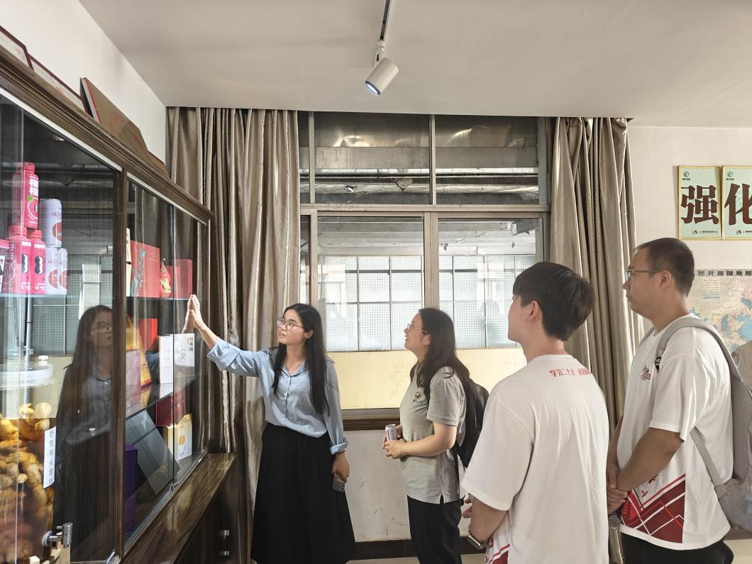 步入生产车间,实践团考察了公司引进的现代化“全自动”饮料生产线,从堆积如山的杨梅、玉竹等原材料,到清洗、分拣、压榨提取、高温灭菌,再到精准灌装、贴标、打包入库,整个流程高度自动化,井然有序。公司技术负责人向团队详细讲解了每一个环节的工艺标准和品控要求。在公司负责人的陪同下,实践团参观了企业的产品展厅,对旗下“坤乾”品牌的玉竹饮料、杨梅汁等系列产品有了直观的了解。