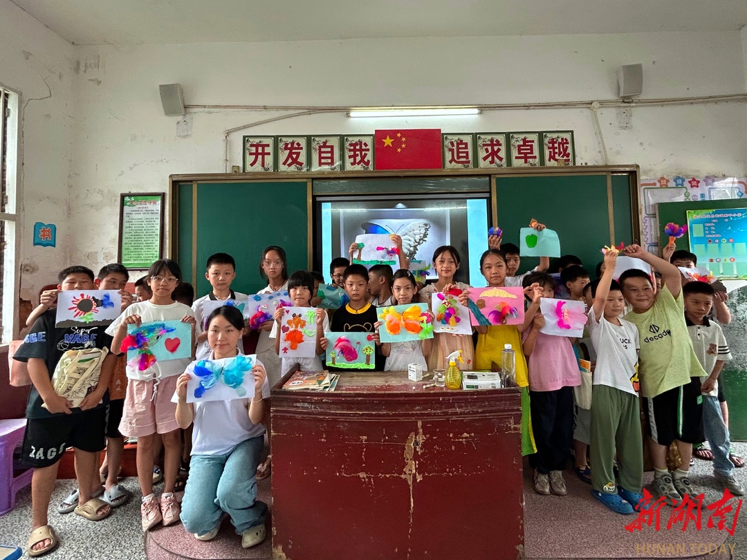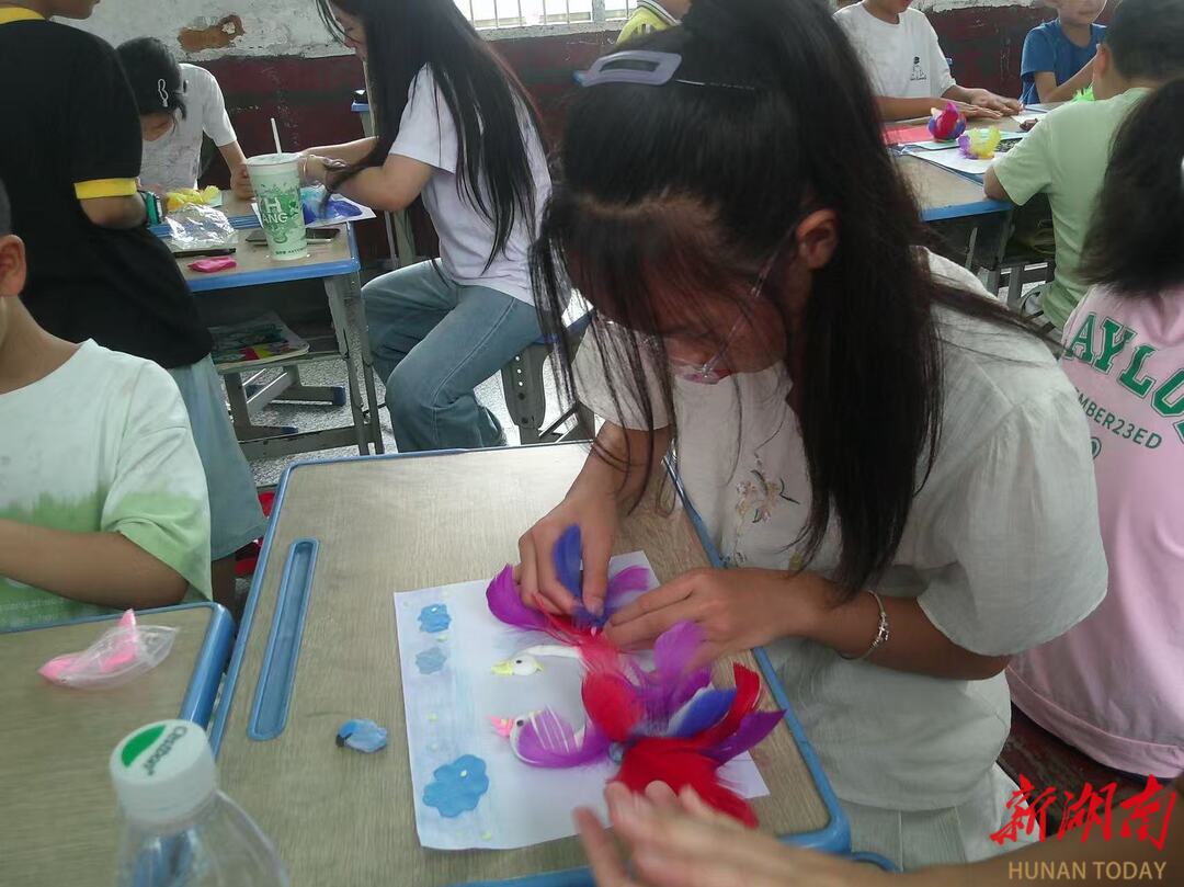7月23日上午湖南交通工程学院“湘交育禾”教育志愿服务团在湖南省邵阳市洞口县文昌街道新平小学为60名学生开展了一场非遗羽毛画体验活动,带领孩子们用灵动的羽毛勾勒出斑斓的创意世界。