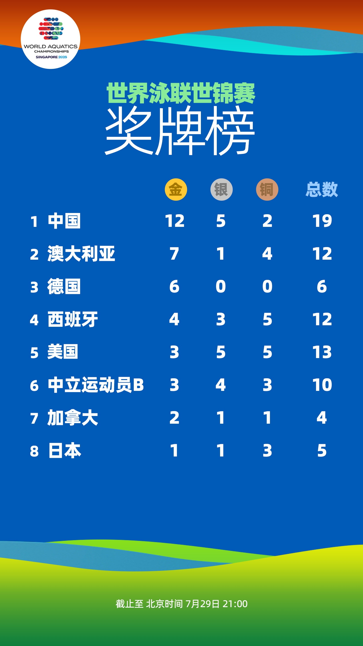 2025年世界泳联世锦赛在新加坡进行中,截至29日21时,中国队以12金5银2铜在奖牌榜暂列第一。