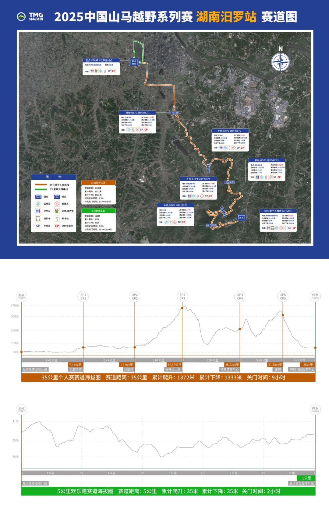 赛道数据:距离35公里,累计爬升:1372米,累计下降:1333米,沿途设5个检查点、7个补给站(含起点、终点)。