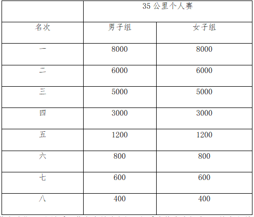 (二)本次比赛总奖金5万,比赛成绩以官方电子计时为准,采用枪声成绩,录取35公里个人赛男女前8名,其中前3名颁发奖杯。