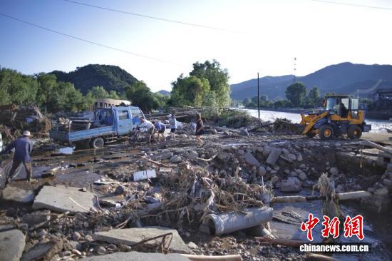 7月29日,天津市蓟州区下营镇下营村,村民经过被洪水冲垮的路段。7月27日,强降雨突袭天津蓟州区,当地爆发了有水文记录70年来的最大山洪,造成泃河沿线13个村庄进水。目前,灾后恢复工作有序进行。