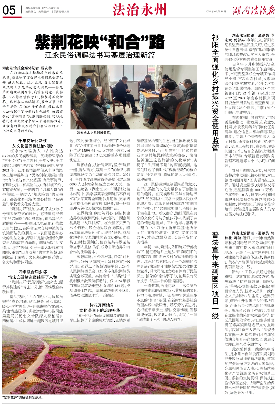 一树紫荆,两地花香——这朵绽放在湘桂走廊的调解之花,其独特的文化魅力与治理智慧,不正是中华民族生生不息的“和合”基因,在新时代基层社会治理实践中最鲜活、最芬芳的表达吗?它根植千年沃土,情法交融铸魂,智慧赋能强基,边界共治同心,绘就了一幅“案结事了人和”的动人画卷。