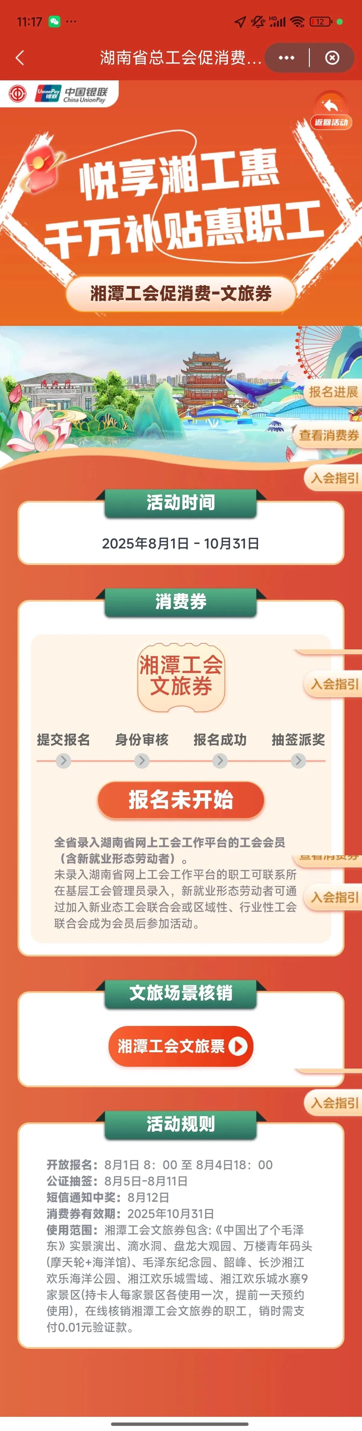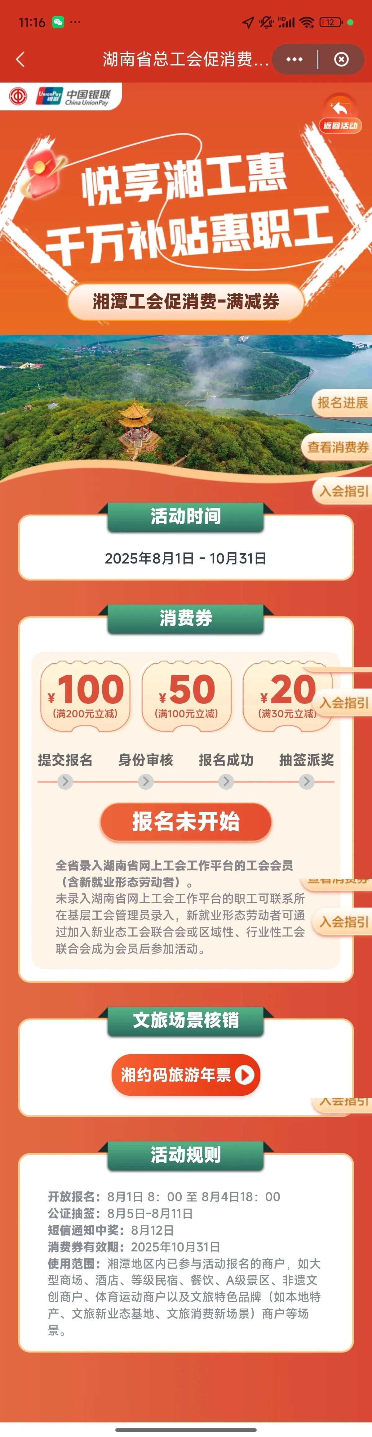 本次活动由市总工会、市文旅广体局、市商务局联合举办,面向全市所有工会会员发放500万元电子消费券,并将持续到10月底,以真金白银为职工消费减负,为湘潭经济发展添活力。消费券分为“工会定向文旅券”和“定额满减券”两大类,覆盖文旅、商超、餐饮等多个场景。