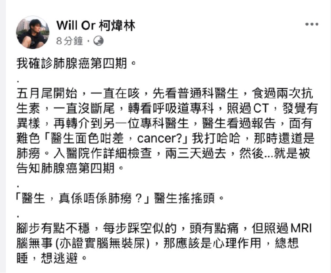 在电影《别叫我“赌神”》中饰演周润发“儿子”的柯炜林(Will Or),在社交平台公布了一个令人揪心的消息:确诊肺腺癌第四期,已开始靶向治疗。他以标志性的幽默写道,从持续咳嗽被当“小感冒”,到最终确诊晚期,过程曲折。更让人动容的是,父亲那句“为什么不是我”——亲情,成了他抗癌路上最坚韧的铠甲。