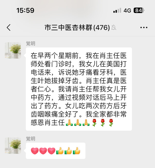 湖南日报7月31日讯(全媒体记者 张春祥 通讯员 谢莉娜)“我在肖主任医师处看门诊时,我女儿在美国打电话来,诉说她牙痛……肖主任帮我女儿开中药方……女儿吃药后牙齿咽喉痛全好了,我全家都非常感恩肖主任!”近日,在长沙市第三医院(湖南大学附属长沙医院)中西医结合科的医患交流群,患者觉明用质朴的留言,向中西医结合科主任肖智表达了家人跨越山海的敬意。