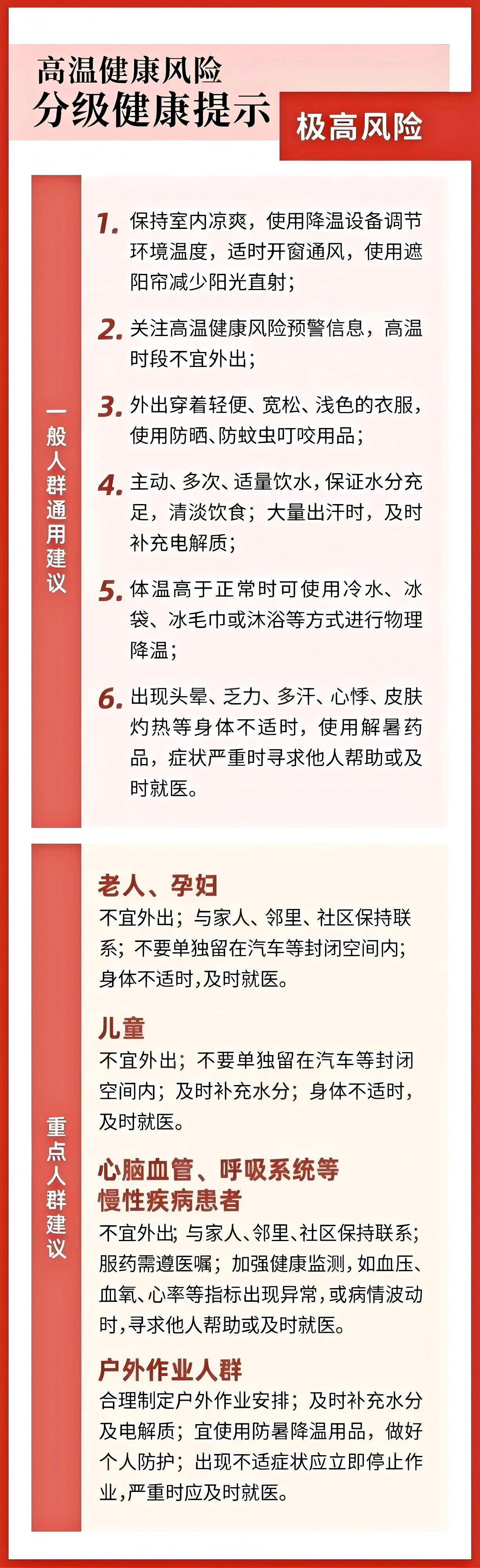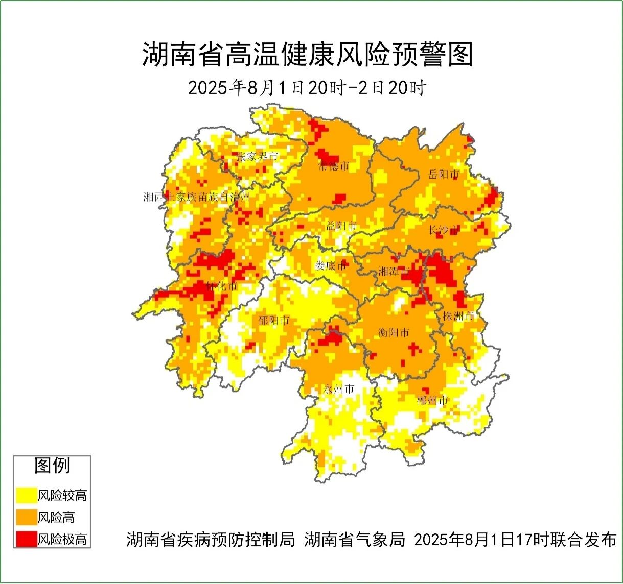 湖南省疾病预防控制中心今日转发由湖南省疾病预防控制局、湖南省气象局8月1日17时联合发布高温健康风险预警和健康提示: