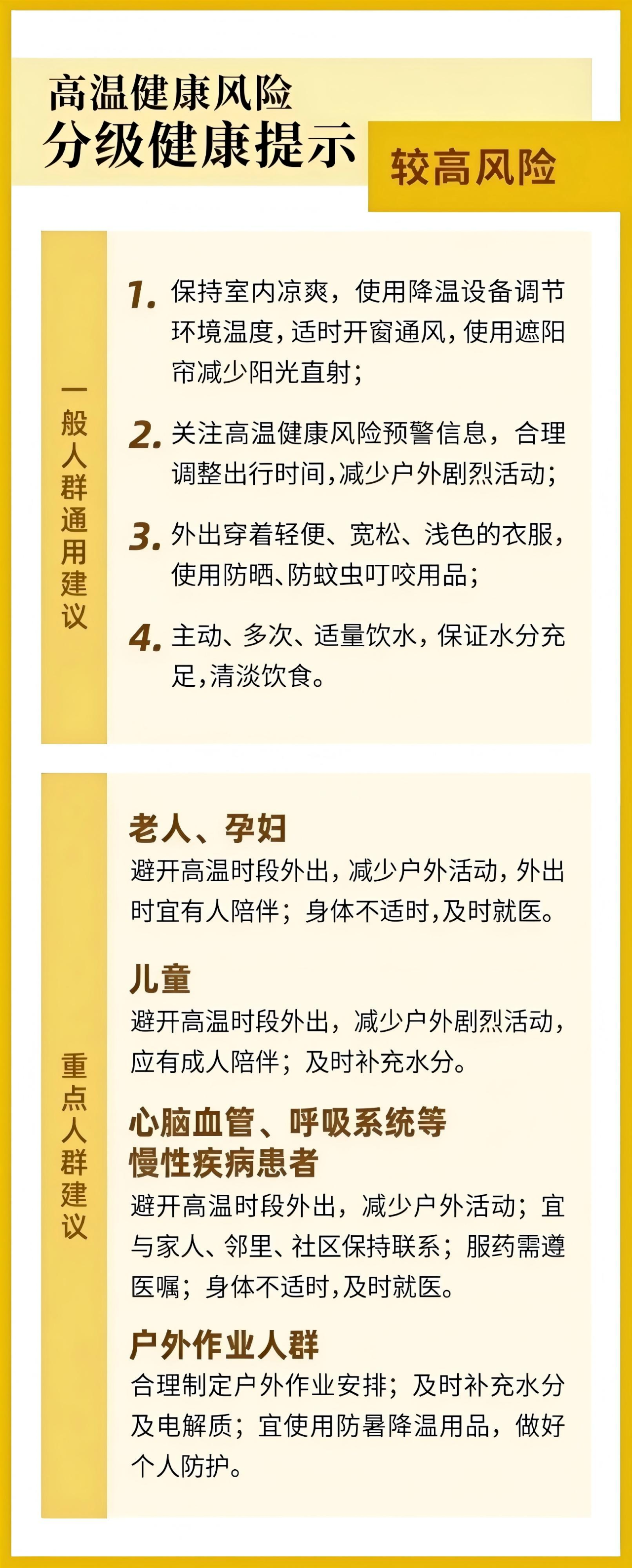 请公众及时关注预警信息变化,保持室内凉爽,避开高温时段外出,减少户外活动,保证充足饮水。老人、孕妇、儿童、慢性病患者加强关注自身健康状况,如有不适请及时就医。户外作业者注意防暑降温。