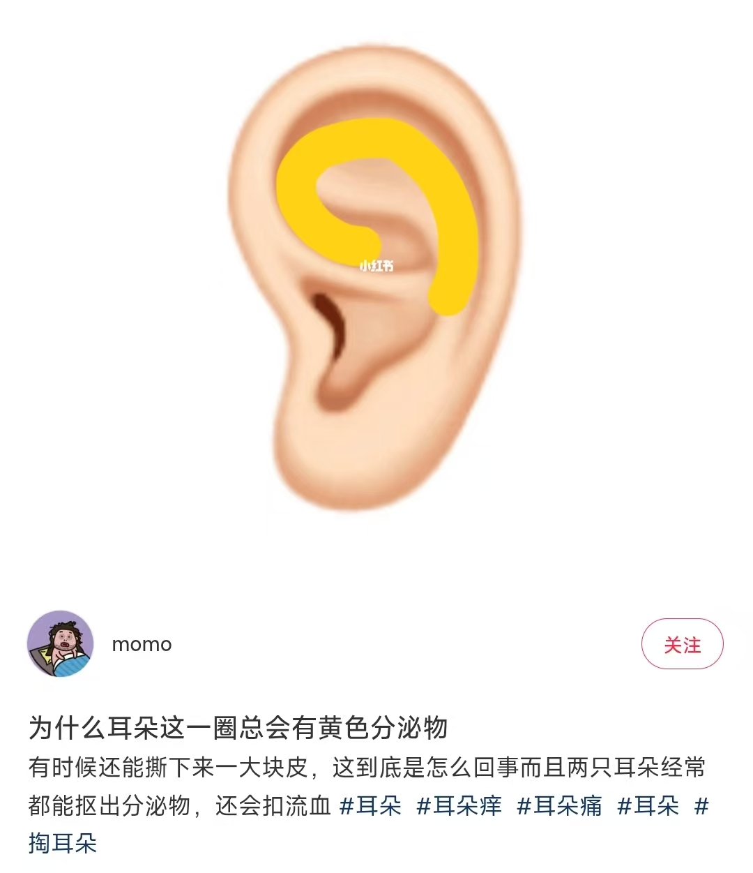 大家有没有过类似的体验,有的时候耳骨凹进去的一圈,用指甲刮一下会出现黄黄的东西。