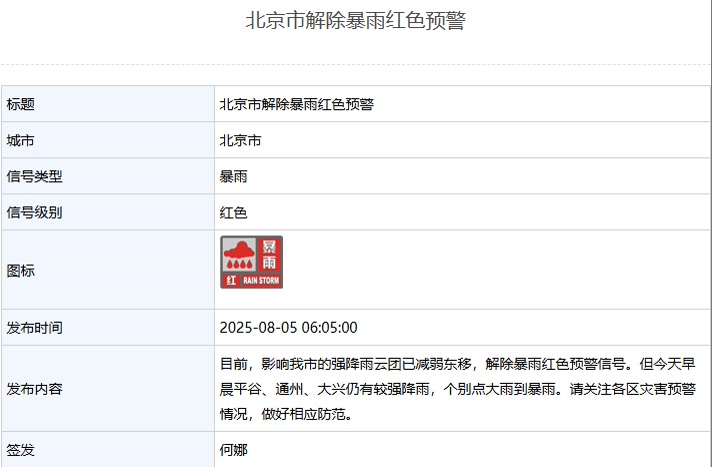 北京市解除暴雨红色预警