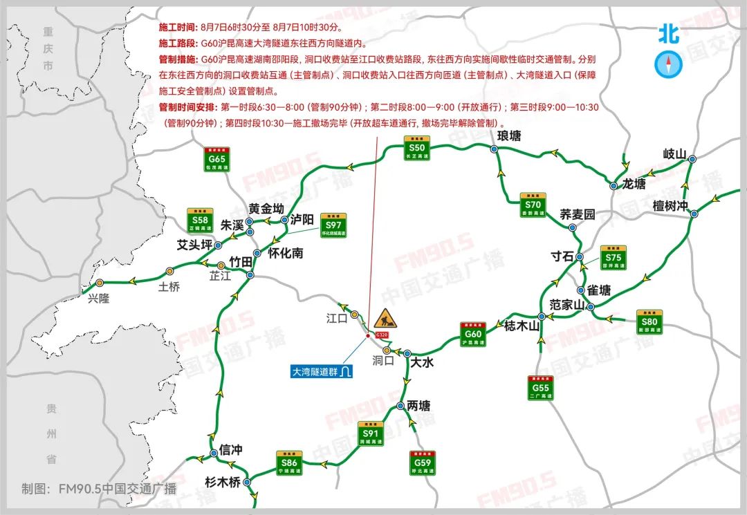 G60沪昆高速湖南邵阳段,大湾隧道群西往东方向,实施间歇性临时交通管制。分别在西往东方向的拱坝隧道入口(主管制点)、月溪隧道入口(保障施工安全管制点)、芭蕉溪隧道入口(保障施工安全管制点)设置管制点。