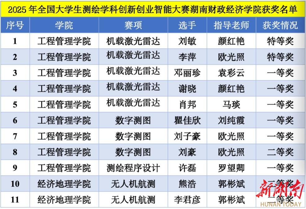 8月1日,在由中国测绘学会教育工作委员会主办的2025年全国大学生测绘学科创新创业智能大赛中,湖南财政经济学院代表队表现卓越,斩获特等奖2项、一等奖6项、二等奖3项,创参赛历史最佳成绩。