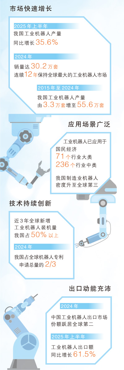 “先前,我们的产品更多销往光伏企业。近几年,根据市场需要,我们还研发和生产了适合汽车、家电等制造的机器人产品。”在埃夫特副总经理张帷看来,消费品以旧换新政策带来新能源汽车、电子产品、家电等销量大幅上升,推动相关企业扩大生产规模、提升生产效率,给埃夫特带来新的发展机遇,同时,国家持续推动制造业智能化改造,下游企业对工业机器人的需求旺盛,公司有了更大的市场。