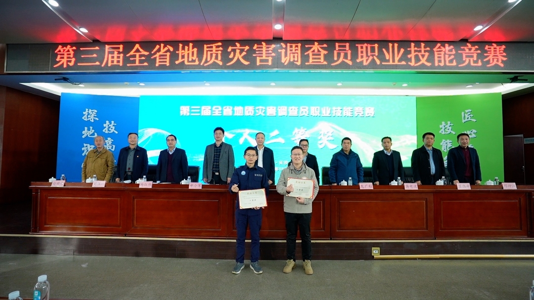2024年11月27日,在第三届湖南省地质灾害调查员职业技能竞赛中,获得第3名的覃佐辉(左)接受颁奖。