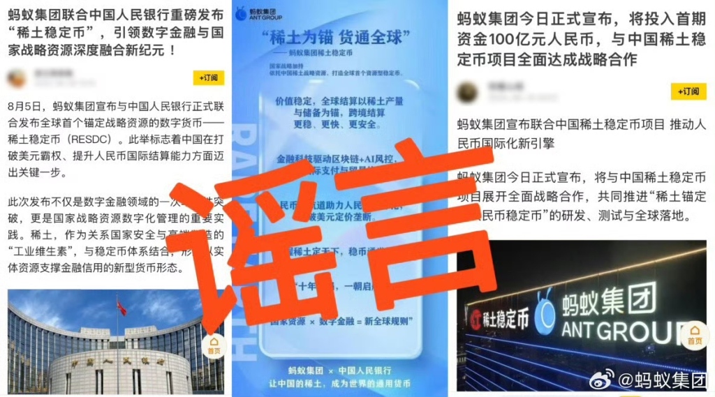 蚂蚁集团辟谣“共建全球首个稀土人民币稳定币”。