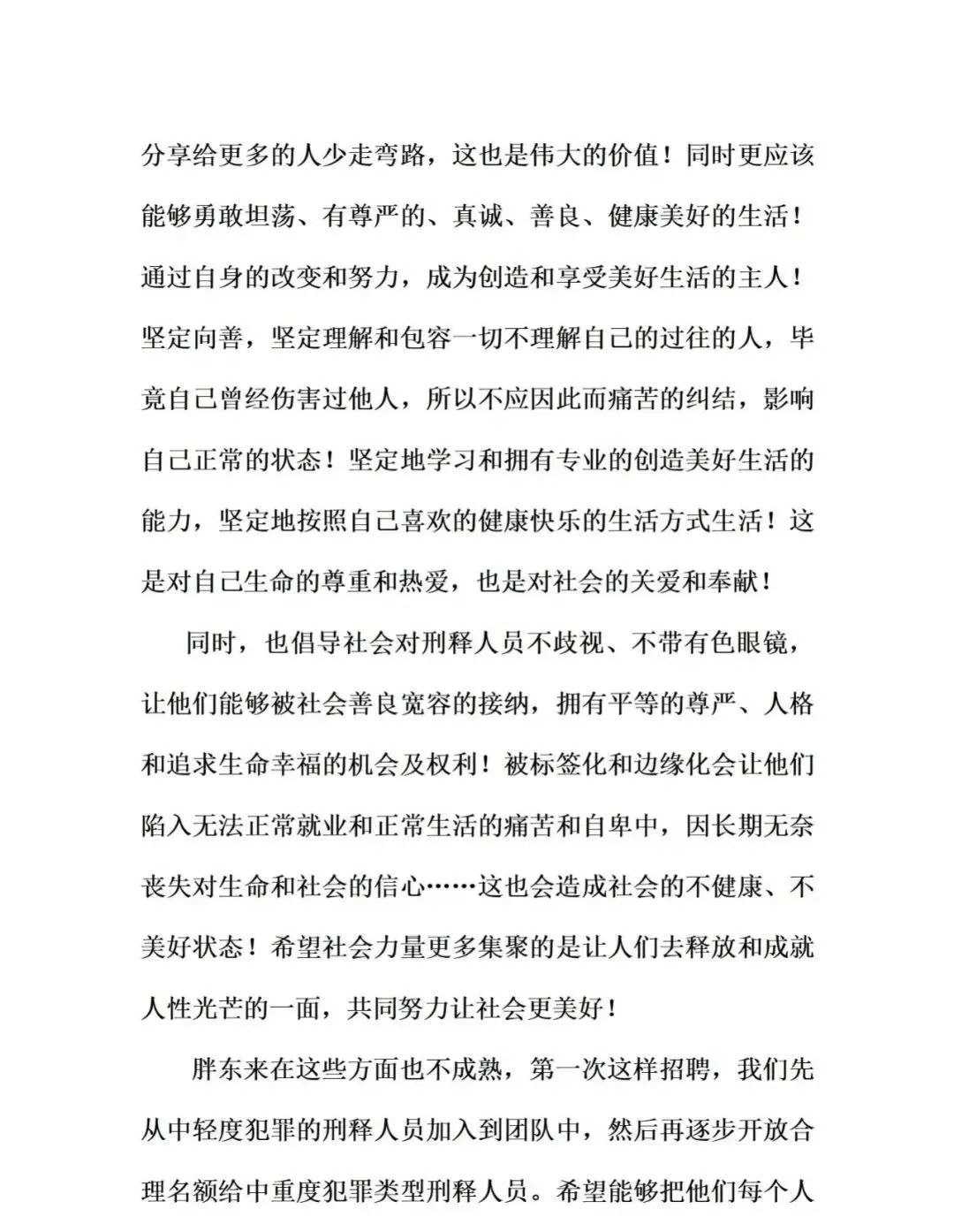 胖东来倡导社会对刑释人员不歧视、不戴有色眼镜,让他们能够被社会善良宽容的接纳,拥有平等的尊严、人格和追求生命幸福的机会及权利。
