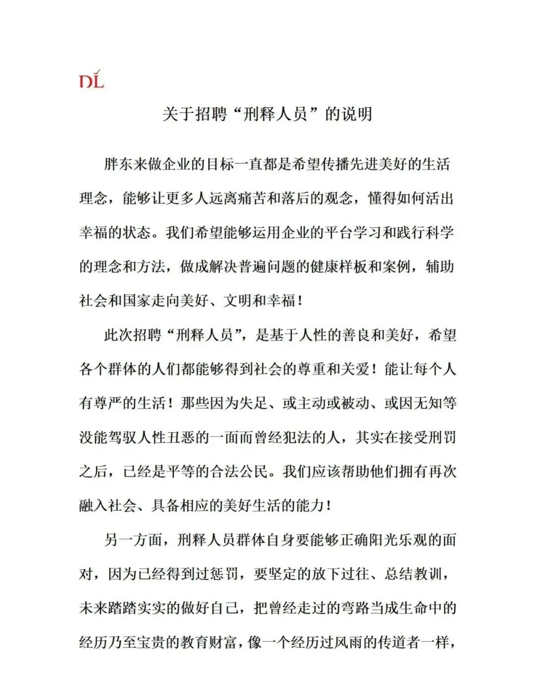 8月10日深夜,胖东来创始人于东来在社交平台发布关于招聘“刑释人员”的说明。