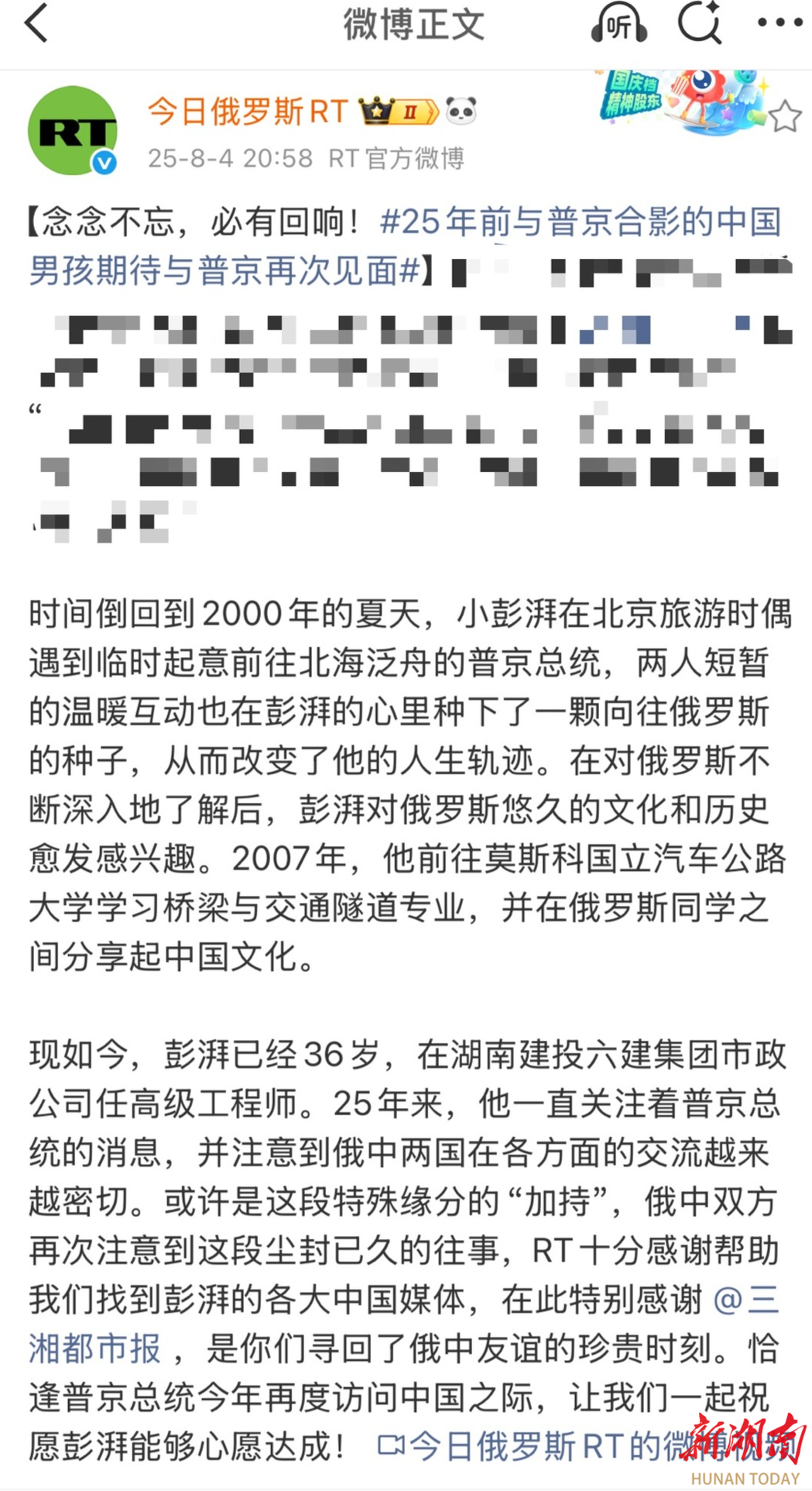 8月4日,“今日俄罗斯RT”微博账号发文特别感谢三湘都市报微博。微博截图
