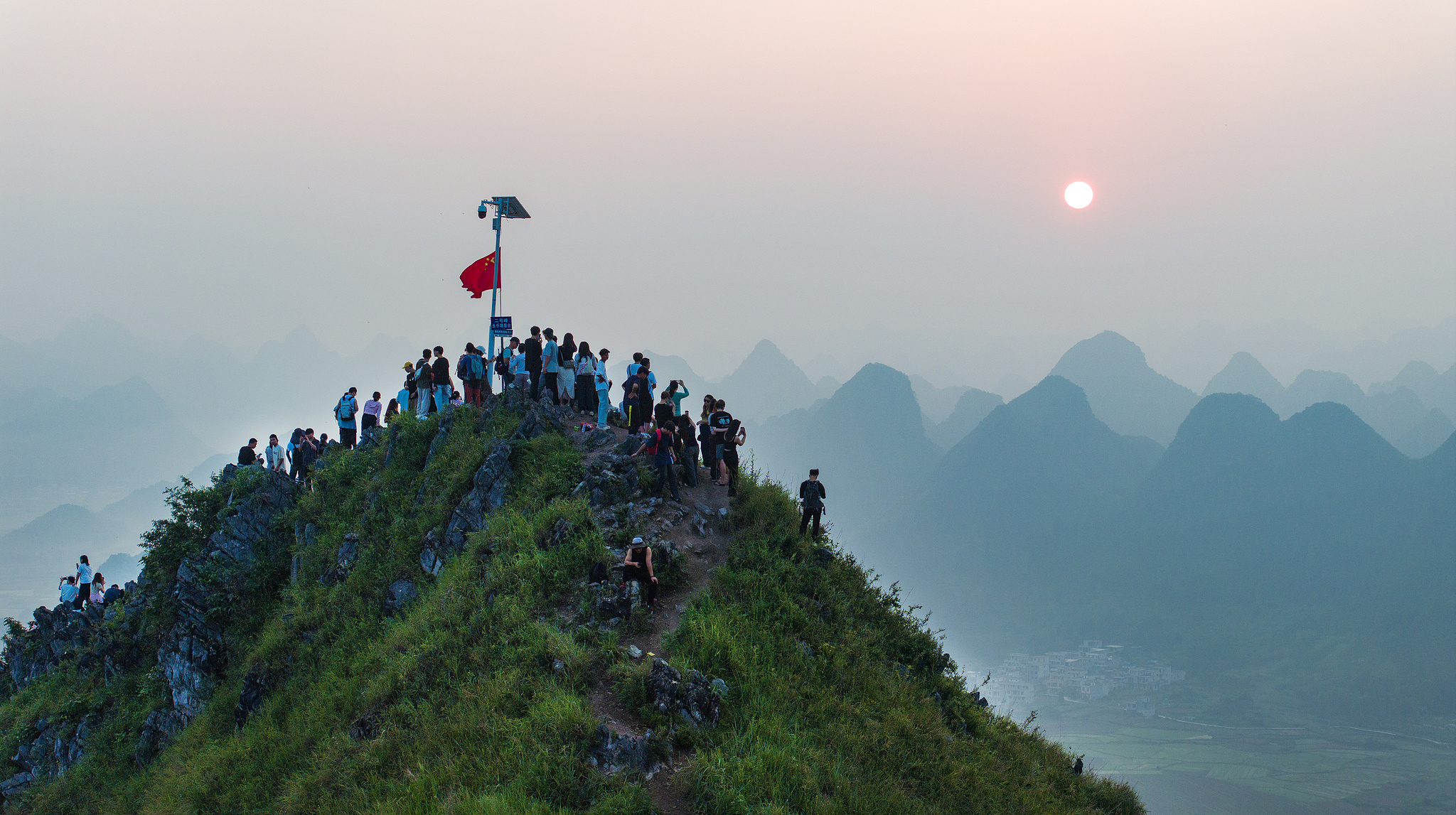 △广西崇左,市民游客登上天等县剑龙山观日出。