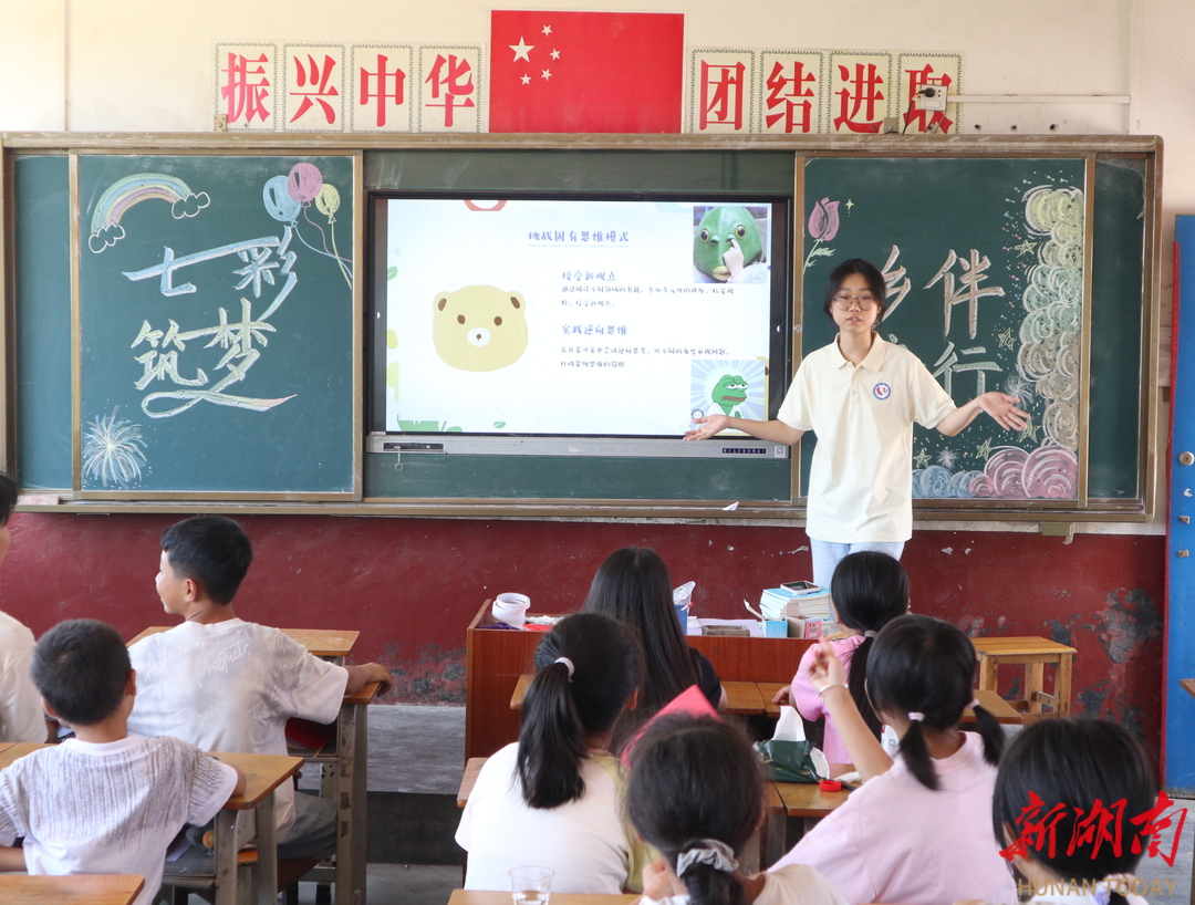 七月的月英村,蝉鸣把空气揉的发烫。倚靠在月英村小斑驳的教室后门,我望着讲台上同伴张珂文的身影,她正站在讲台上给孩子们上课。讲台下,一张张稚嫩的小脸就像是一株株向阳而生的向日葵,聚精会神的跟着老师的身影转动。我不由得想起我们长沙学院一队人第一天到湖南省邵阳市洞口县高沙镇的这个村落,在路边碰到这群“小泥猴”正追着笑声满街跑的场景。这是我们“七彩筑梦,乡伴童行”暑期社会实践团来到月英村上课的第三天,7月16日,也是令我印象最深刻的一天。
