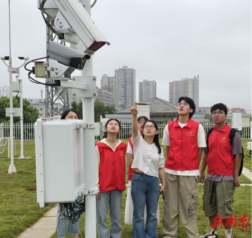 (平江县气象局工作人员向服务队队员介绍现代化气象观测设备曾品瀚摄)