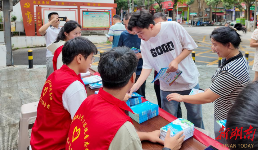 8月13日,志愿服务队转战平江县汉昌街道,将“三下乡”服务重心延伸至社区。队员们协同街道工作人员,开展防汛减灾和自然资源保护主题宣传活动。在活动现场,队员们热情地向社区居民发放并详细讲解《气象灾害应急避险手册》和《自然资源科普手册》。他们不仅用通俗易懂的语言和当地方言解读暴雨预警等级、山洪避险路线等关键防灾知识,更重点普及了当地自然资源的价值、面临的威胁及保护措施,生动宣传“绿水青山就是金山银山”的“两山”理论,将生态环保的文化理念播种到居民心中。
