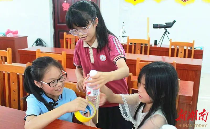 村民刘大姐看着孩子们认真学习防溺口诀的样子,欣慰地说道。“大家知道废旧电池该扔在哪里吗?”服务团的“环保实验室”里,队员们正带领孩子们用矿泉水瓶、纸箱等废品制作简易浇水器。结合新田村的生态现状,团队精心设计了“垃圾分类闯关”“家乡水质小调查”等特色活动,让孩子们带着pH试纸走进田间地头,记录不同水源的酸碱度。