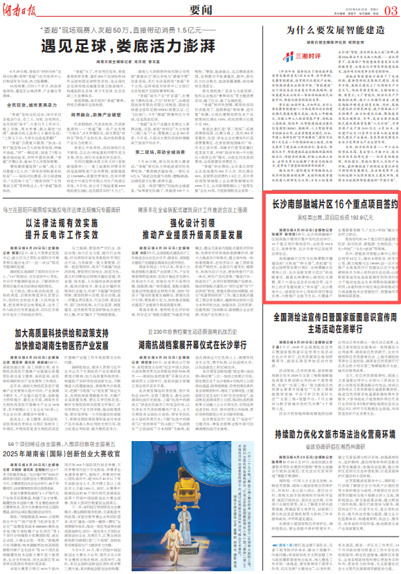 现场,智链星河智能云算中心、创一芯片电感产业基地、东超科技中南区域总部等16个重点项目集中签约,涵盖数字经济、低空经济、新能源、生物医药、“文化+科技”、“文化+旅游”等领域,总投资192.8亿元。其中,天心区签下11个项目,成为本次签约的“主力军”。