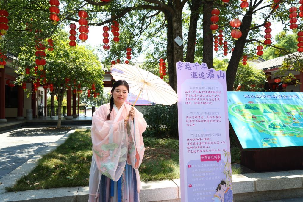 “霓裳焕新”汉服体验环节为活动日上、下午前30名女性游客提供免费汉服,并附带专业古风妆造快速盘发服务。景区门口,60余套汉服和精美配饰“翘首以盼”,吸引许多游客进行尝试。来自株洲的罗女士提前知道君山岛景区的汉服体验活动并为此而来,她表示:“今天穿着汉服像仙女一样!拍照游玩非常开心。”身着华美汉服的游客漫步于君山岛的湖光山色之中,仿佛真正实现了“穿越千年”的梦境。