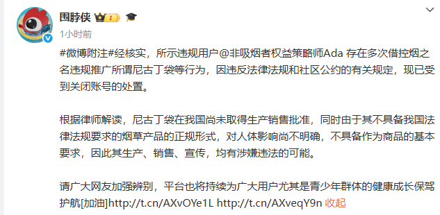 8月30日,@围脖侠 发文:经核实,所示违规用户@非吸烟者权益策略师Ada 存在多次借控烟之名违规推广所谓尼古丁袋等行为,因违反法律法规和社区公约的有关规定,现已受到关闭账号的处置。