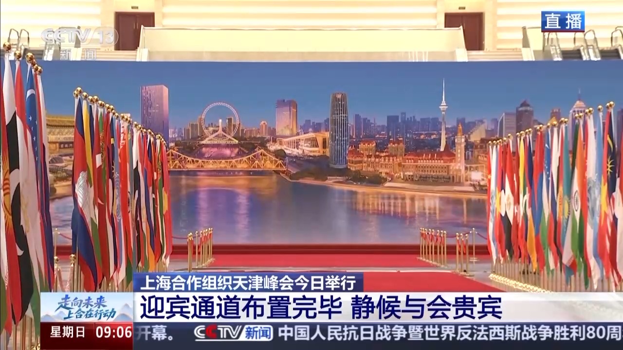 总台央视记者 王春潇:在红毯的远端我们看到的是以天津的海河夜景为主题的背景板,届时外国领导人和国际组织负责人,会在这里拍摄天津版的上合组织大家庭合影,也为此行留下特别的“天津记忆”。
