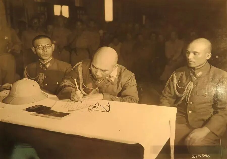 1945年8月21日,日本投降代表今井武夫在投降备忘录上签字。