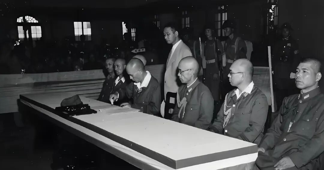 1945年9月9日,冈村宁次(右四)在降书上签字并盖章。