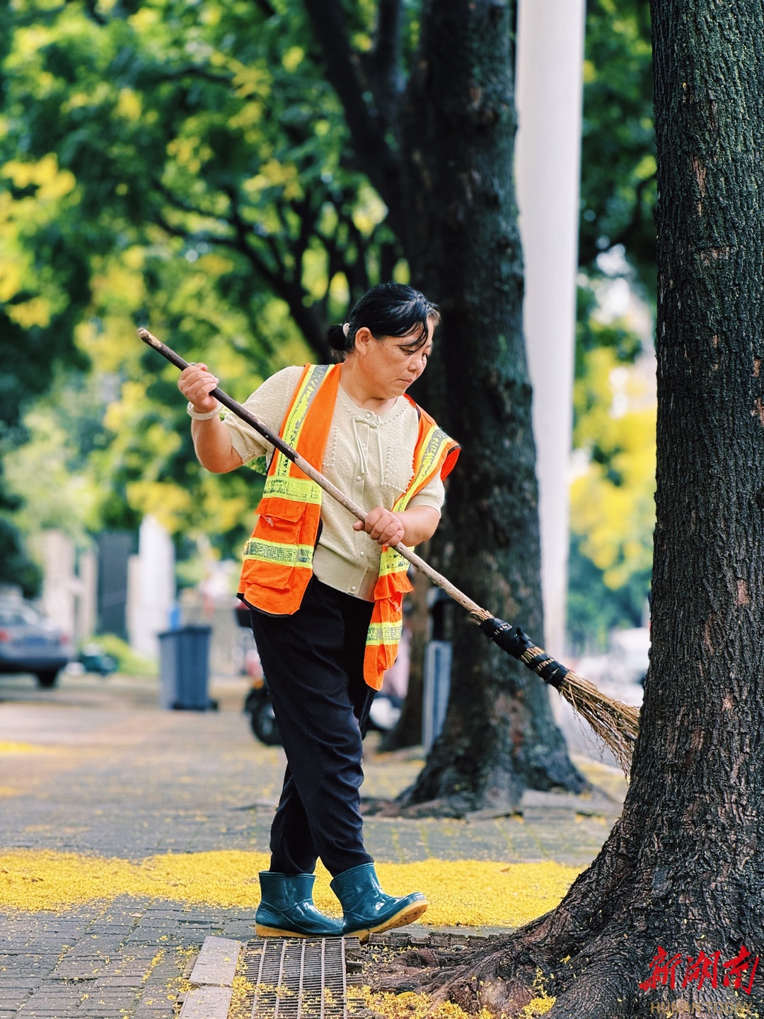 有一群身影格外动人——身着橙黄工装的环卫工人,她们正握着扫帚轻轻清扫这一地金黄。不疾不徐,怕惊扰了这份秋日浪漫,将散落的栾树花归拢成小堆,既护了街道的整洁,也留了枝头的明媚。