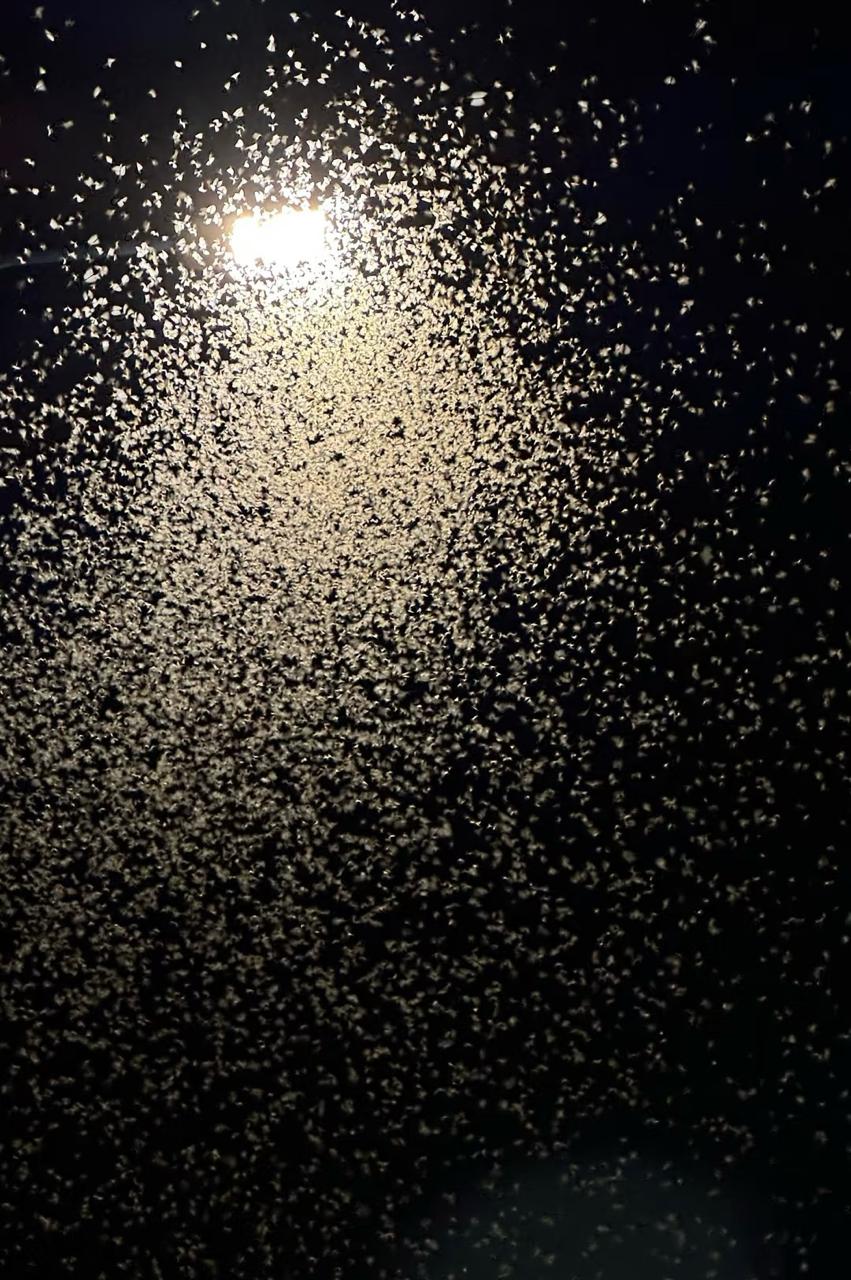 从他们晒出的图片中可以看到,这些“飞蛾”大量聚集在路灯下,就像漫天飞雪。数量多的地方,飞虫密集程度甚至能遮挡住路边的店铺招牌,让不少网友犯了“密集恐惧症”。