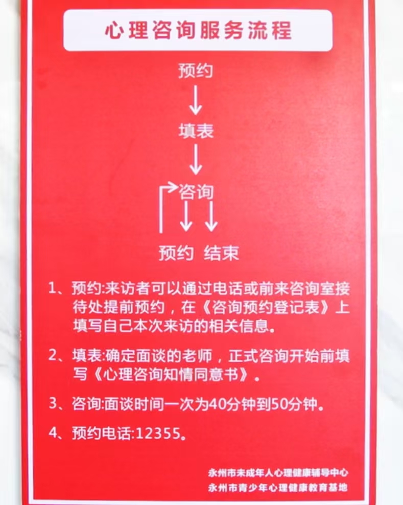 图为永州市青少年心理健康教育基地心理咨询服务流程。 陈思思 摄