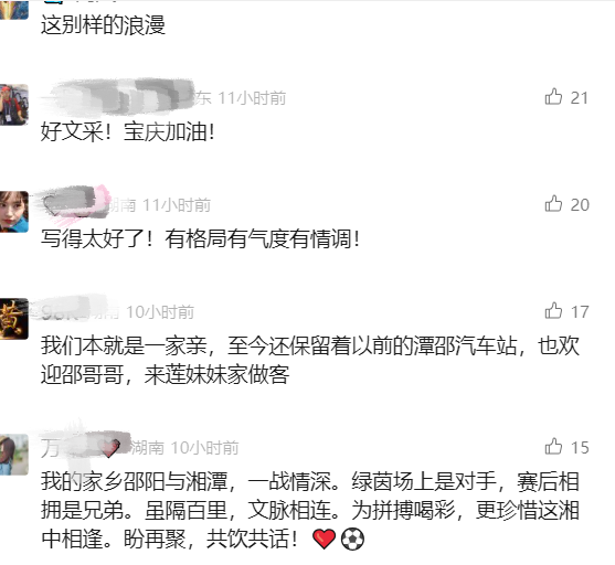 这场比赛因车牌代码衍生的“E踢C”梗而备受关注,但更重要的是,赛事成了湘潭与邵阳两地文化交流的纽带。赛后,两地以“潭潭”和“邵邵”之名互致信笺,邵阳真诚邀请“同登崀山,去南山牧场”,湘潭则回应“引你走进窑湾古街”,这种以球为媒的文化对话,被网友盛赞为“文化CP”。