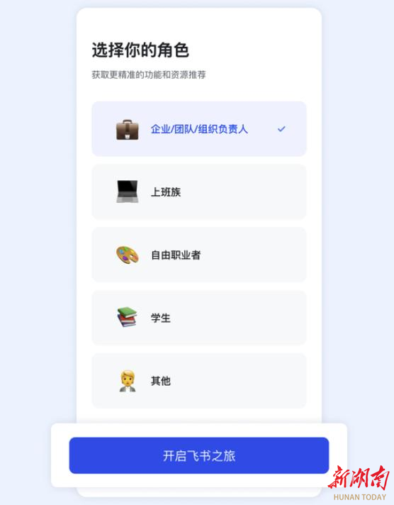 2.选择你的角色(如上班族/学生等),点击开启飞书之旅,企业即创建完成。