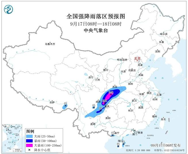 中央气象台9月17日06时继续发布暴雨黄色预警:预计,9月17日08时至18日08时,四川盆地中东部和南部、贵州西北部、云南北部、重庆西部和北部、陕西南部、湖北西北部、河南西南部以及西藏东南部、广西南部、广东西南部、海南岛等地部分地区有大到暴雨,其中,四川盆地东北部、重庆西部等地部分地区有大暴雨(100~240毫米)。上述部分地区伴有短时强降水(最大小时降雨量20~50毫米,局地可超过70毫米),局地有雷暴大风等强对流天气。