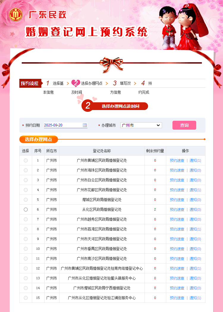 17日下午,广东民政婚姻登记网上预约系统显示,9月20日当天,除从化区婚姻登记处驻江埔街服务中心还剩2个预约号外,广州其他14个婚姻登记处剩余预约量均为0。