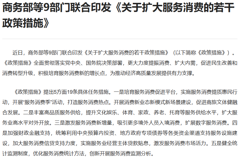 近日,商务部等9部门联合印发《关于印发扩大服务消费的若干政策措施》,将服务消费作为新的经济增长点。