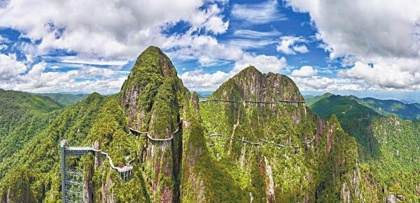 蓝天白云下的宜章县莽山国家森林公园五指峰景区。湖南日报全媒体记者 郭立亮 摄